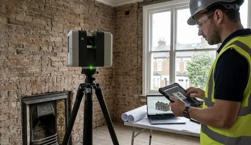 London’s housing stock is uniquely challenging. Georgian and Victorian properties are notorious for “structural movement”—meaning walls are rarely vertical and floors are seldom level. Traditional surveying methods fail to capture these “bows” and “leans.” 3D laser scanning captures 1 million points per second, ensuring your architect has a “digital twin” that accounts for every structural anomaly, reducing risk during the construction phase.